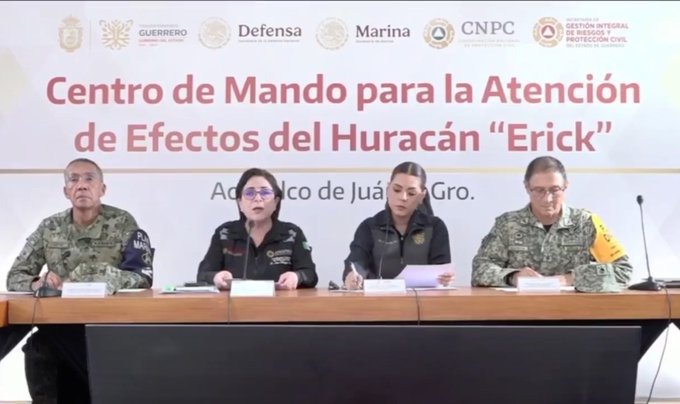 Acapulco, Guerrero.-  La titular de la Coordinación Nacional de Protección Civil, Laura Velázquez Alzúa, informó que se activó la Alerta Naranja ante la intensificación del huracán Erick a Categoría II y detalló que con corte a las 12:00 horas de este miércoles 18 de junio, el fenómeno meteorológico se ubica a 165 km al sur de Puerto Ángel, Oaxaca, y a 345 km al sureste de Punta Maldonado, Guerrero, con vientos máximos de 155 km/h y una velocidad de desplazamiento de 15km/h.