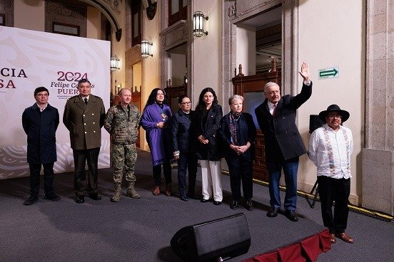 Estuvo en compañía de las secretarías de Gobernación, Luisa María Alcalde Luján; de Seguridad y Protección Ciudadana, Rosa Icela Rodríguez Velázquez; de Cultura, Alejandra Frausto Guerrero y de Relaciones Exteriores, Alicia Bárcena Ibarra; los secretarios de la Defensa Nacional, Luis Cresencio Sandoval González y Marina, José Rafael Ojeda Durán y el director general del Instituto Nacional de los Pueblos Indígenas, Adelfo Regino Montes.