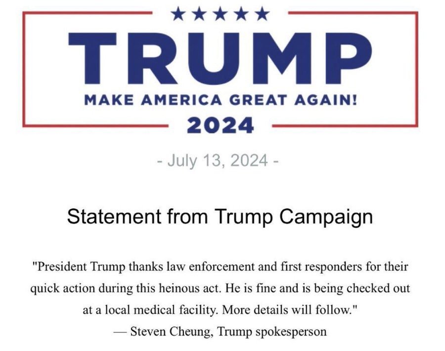 El equipo de Donald Trump agradeció la pronta reacción de las autoridades presentes en el atentado que sufrió. “El presidente Trump agradece a las autoridades y a los socorristas por su rápida acción durante este acto atroz. Está bien y está siendo examinado en un centro médico local”. Steven Cheung, portavoz de Trump.