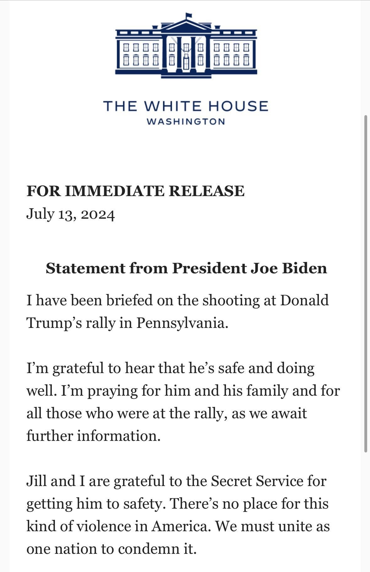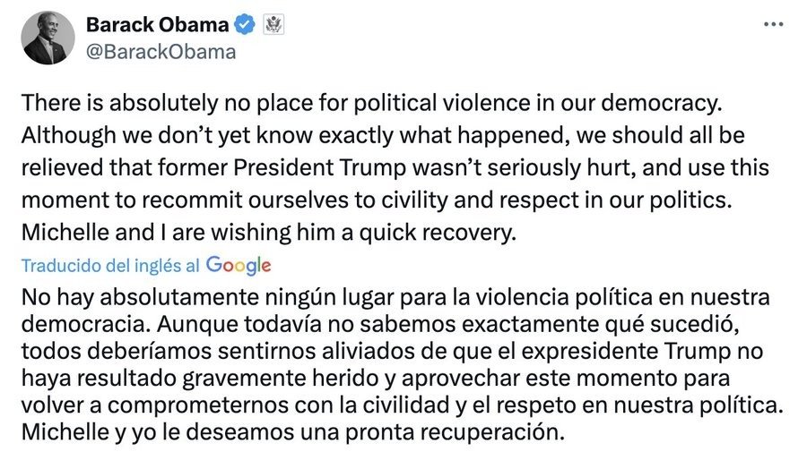 “Estoy agradecido de escuchar que Donald Trump está a salvo y bien. Oro por él y por su familia (…) No hay lugar para este tipo de violencia en Estados Unidos. Debemos unirnos como nación y condenarlo”.