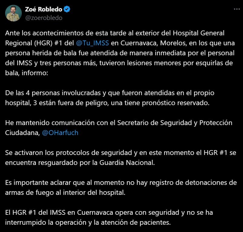 Mientras que la Fiscalía estatal informó que un presunto agresor llegó al nosocomio y accionó un arma de fuego contra el edificio. Por este hecho, al menos tres personas resultaron heridas por esquirla de arma de fuego.