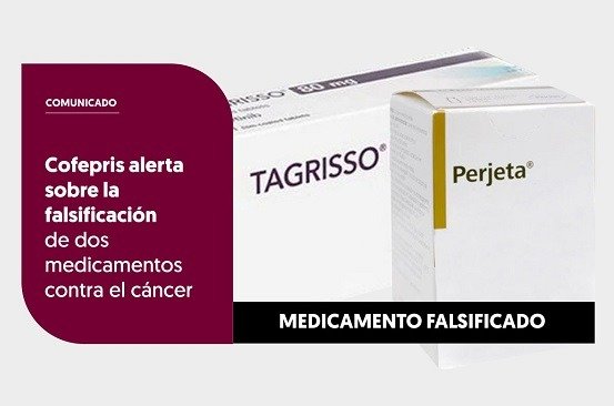 Ciudad de México.- La Comisión Federal para la Protección contra Riesgos Sanitarios (Cofepris) alerta sobre la falsificación y comercialización irregular de dos medicamentos empleados en el tratamiento de tipos específicos de cáncer: Perjeta (pertuzumab) solución 420 mg/ 14 mL (30mg/mL) y Tagrisso (osimertinib) 80 mg.