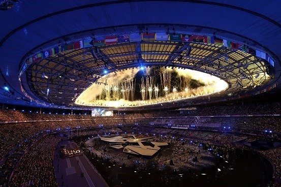 Ahí, se entonó el himno de Francia para dar inicio a la fiesta, en donde los atletas de las diferentes naciones participantes comenzaron a desfilar dentro del recinto, algunos ondeando sus banderas, y otros mostrando las medallas conseguidas.