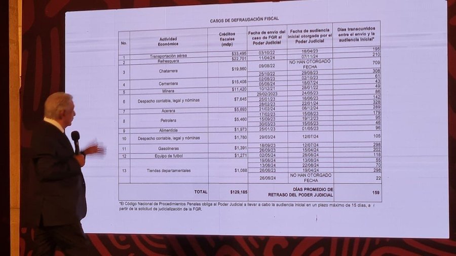 Se trata, de acuerdo con la lista que exhibió el mandatario en la mañanera en el salón Tesorería de Palacio Nacional de una empresa de transportación aérea, una refresquera, una chatarrera, una cementera, una minera, dos despachos contables, legal y de manejo de nóminas, una acerera, una petrolera, una del ramo alimenticio, una gasolinera, un equipo de fútbol y varias tiendas departamentales.