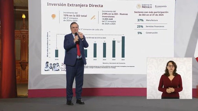 Destacan récord en Inversión Extranjera Directa de casi 41 mil mdd en 3T 2025