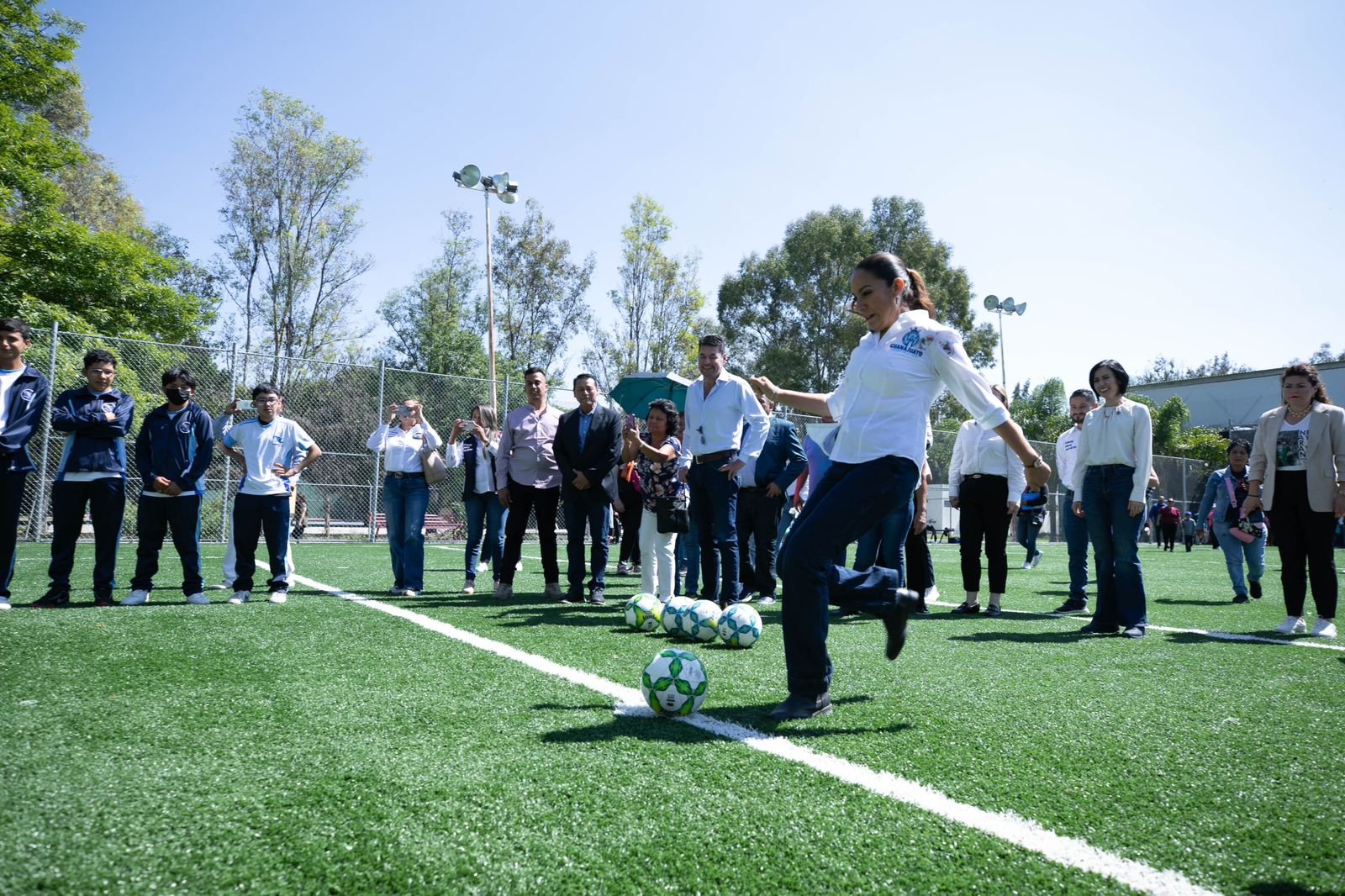 La Gobernadora refrendó su compromiso por impulsar el deporte y acompañada del Presidente Municipal, Leonardo Solórzano, tiró penaltis en la cancha de futbol siete recién rehabilitada.