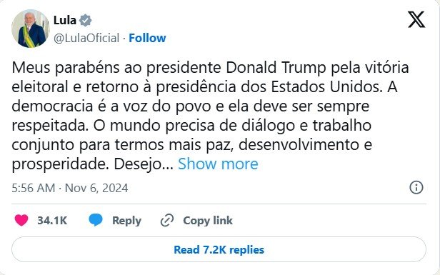 Por su parte, el presidente de Brasil, Lula da Silva, envió sus felicitaciones al presidente electo de Estados Unidos mediante un mensaje en sus redes sociales: “La democracia es la voz del pueblo y siempre debe ser respetada. El mundo necesita diálogo y trabajo conjunto para tener más paz, desarrollo y prosperidad. Le deseo suerte y éxito al nuevo gobierno”.