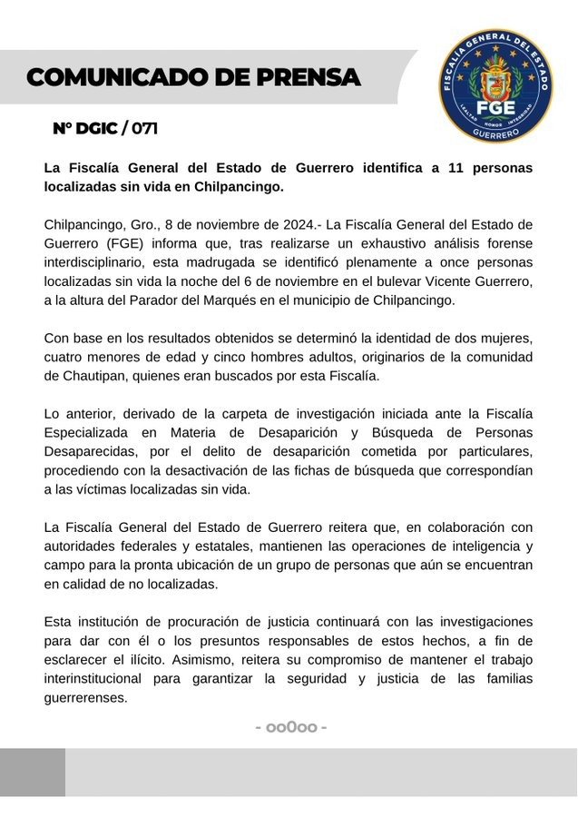 Chilpancingo, Guerrero.- La Fiscalía de Guerrero identificó a las once personas localizadas sin vida la noche del pasado 6 de noviembre en Chilpancingo; se trata de dos mujeres, cinco hombres adultos y cuatro menores de edad originarios de la comunidad de Chautipan, quienes eran buscados por dicha Fiscalía.