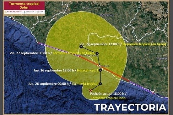 La tormenta John está registrando un comportamiento variable y se mueve lentamente, por lo que se recomienda que los estados de Colima, Michoacán y Guerrero extremen precauciones por lluvias muy fuertes a puntuales extraordinarias, deslaves, inundaciones, así como crecida de ríos y arroyos.