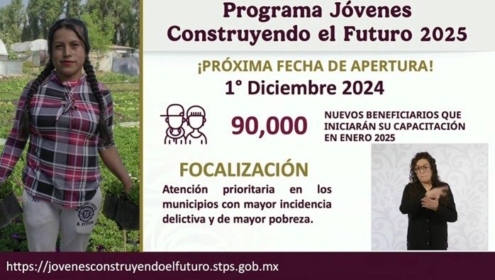Ciudad de México.- En 2025, Jóvenes Construyendo el Futuro tendrá 90 mil nuevos beneficiarios, informó Marath Bolaños, titular de la Secretaría de Trabajo y Previsión Social (STPS), y adelantó que la convocatoria abre el próximo 1 de diciembre en el sitio web https://www.jovenesconstruyendoelfuturo.stps.gob.mx/