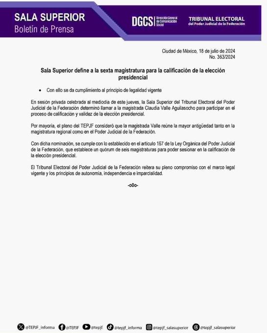 No es la más experimentada pero sí la más antigua de acuerdo con el criterio que tomó el pleno de la Sala Superior del Tribunal Electoral del Poder Judicial de la Federación (TEPJF) al elegir a Claudia Valle Aguilasocho, de la Sala Monterrey, para ser la sexta magistrada que participará en la calificación de la elección presidencial.