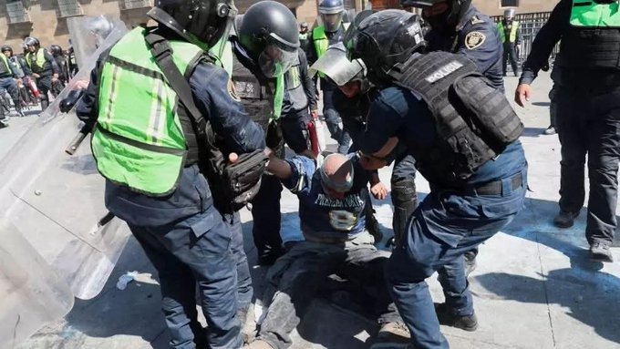 Aunque se trataba de una convocatoria “pacífica”, personas encapuchadas retiraron las vallas de protección colocadas en Palacio Nacional. Asimismo, lanzaron piedras y petardos contra los elementos de seguridad capitalinos, quienes utilizaron extintores para replegar a las y los manifestantes. Por su parte, la polícia capitalina informó que privilegió la protección de quienes marcharon de forma pacífica y la contención de agresiones.