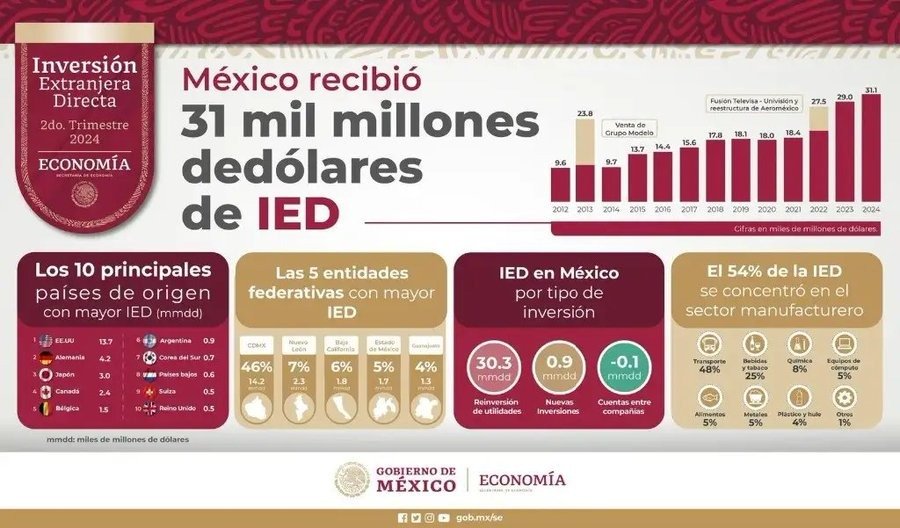 México.- La Secretaría de Economía informa que, al segundo trimestre de 2024, la Inversión Extranjera Directa (IED) en México alcanzó los 31 mil 096 millones de dólares (mdd), monto 7 por ciento superior al mismo periodo de 2023 (29 mil 041 mdd), presentando un nuevo máximo histórico en el periodo desde que se tiene registro.