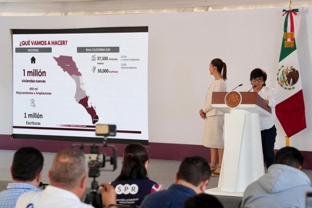 Cabo San Lucas, Baja California sur. La presidenta Claudia Sheinbaum Pardo arrancó el programa de Vivienda para el Bienestar en Los Cabos, Baja California Sur, donde esta mañana da su primera conferencia matutina fuera de Palacio Nacional. La meta sexenal de este nuevo esquema es construir un millón de viviendas. Y por primera vez, se incluye a no derechohabientes y a jóvenes.