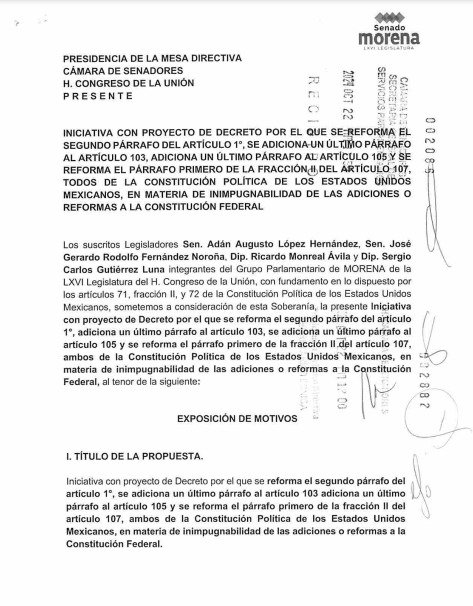 El proyecto de decreto, que también fue suscrito por el senador Gerardo Fernández Noroña y los diputados Ricardo Monreal Ávila y Sergio Gutiérrez Luna, del Grupo Parlamentario de Morena, reforma los artículos 1, 103, 105 y 107 de la Constitución Política.
