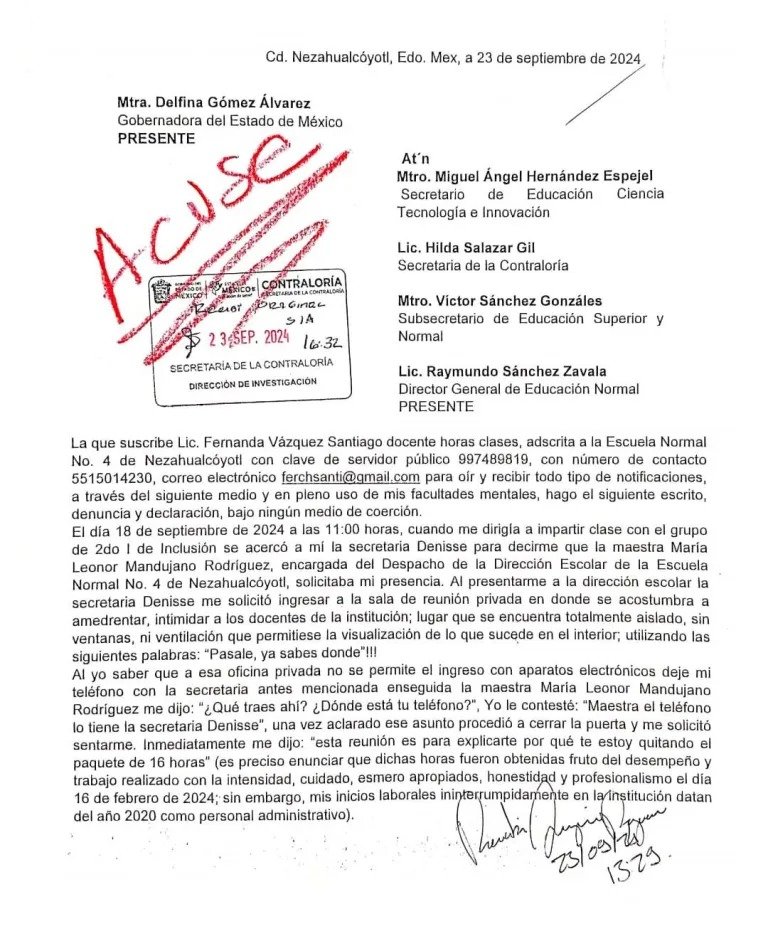 Nezahualcóyotl, Méx.- 3 de octubre de 2024. Profesores y estudiantes de la Escuela Normal No. 4 en Nezahualcóyotl han denunciado ante el portal reporterosenmovimiento.com hostigamientos y malos tratos por parte de la directiva escolar, liderada por Leonor Mandujano Rodríguez y Lourdes Arguello. Los afectados piden apoyo a la gobernadora Delfina Gómez Álvarez y advierten que, de no ser atendidos, podrían bloquear calles del municipio como medida de protesta.