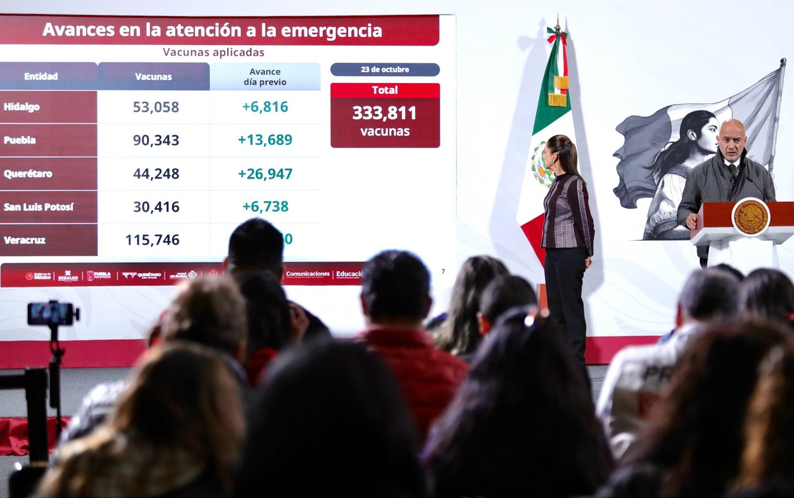 Las labores de limpieza presentan un avance de 83% en Poza Rica y 80% en Álamo. En el estado hay 362 máquinas pesadas desplegadas, 11 helicópteros en operación para atender la zona serrana de Huayacocotla, y se han repartido 90,674 comidas calientes, 136,008 despensas y 29,069 vacunas, además del despliegue de 338 brigadas médicas.