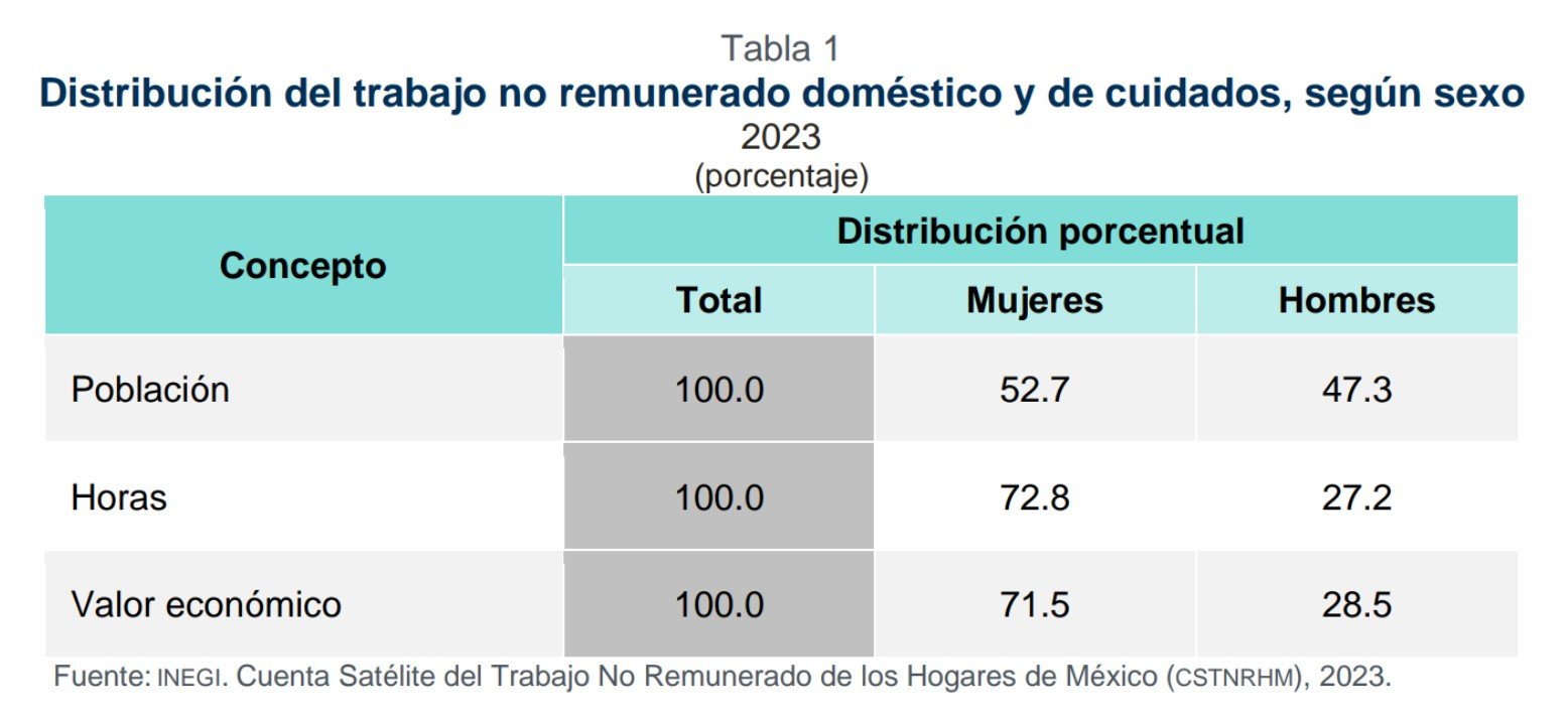 De acuerdo con los resultados de la Cuenta Satélite del Trabajo No Remunerado de los Hogares de México (CSTNRHM) 2023, las mujeres contribuyeron con 71.5% y los hombres, con 28.5% del total.