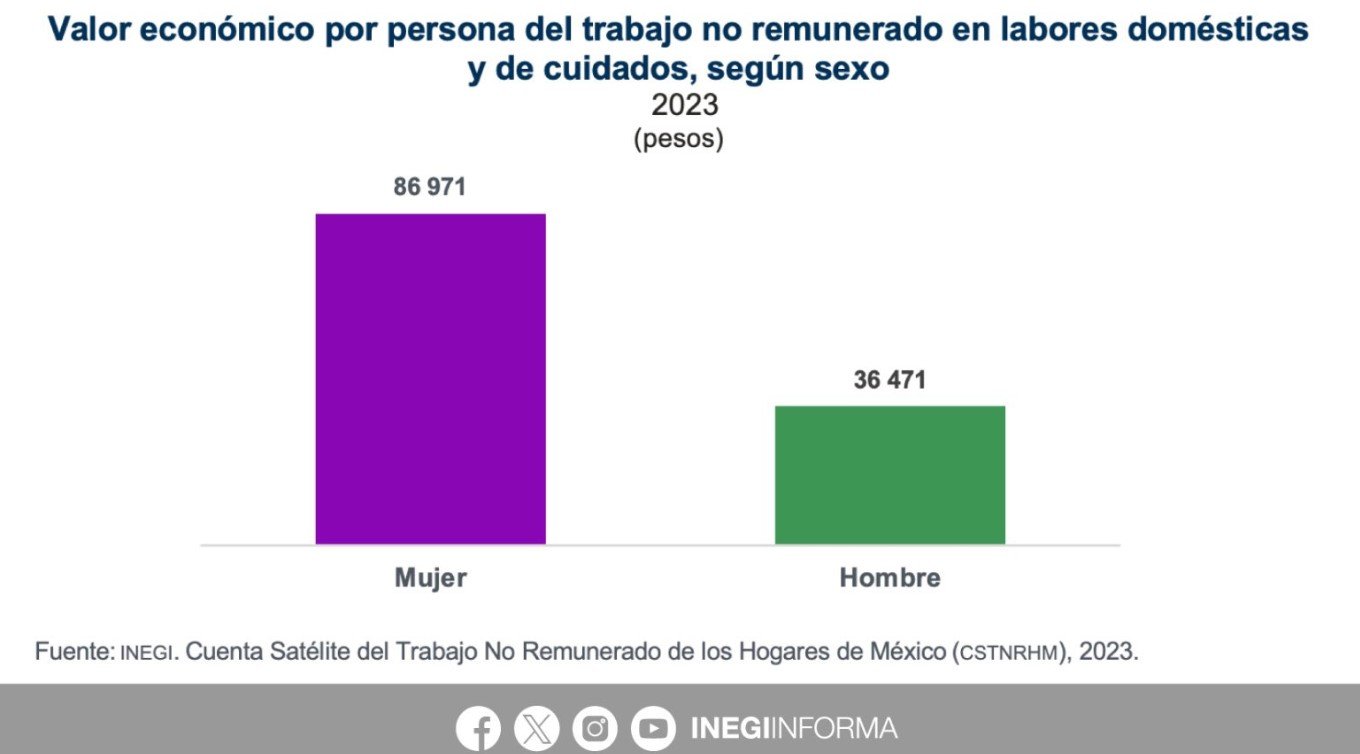 El valor económico neto anual fue de 63 mil 033 pesos, en promedio, por persona. De dicho monto, cada mujer realizó trabajo no remunerado en labores domésticas y de cuidados equivalente a 86 mil 971 pesos anuales. En tanto, cada hombre realizó actividades similares por un monto promedio de 36 mil 471 pesos.