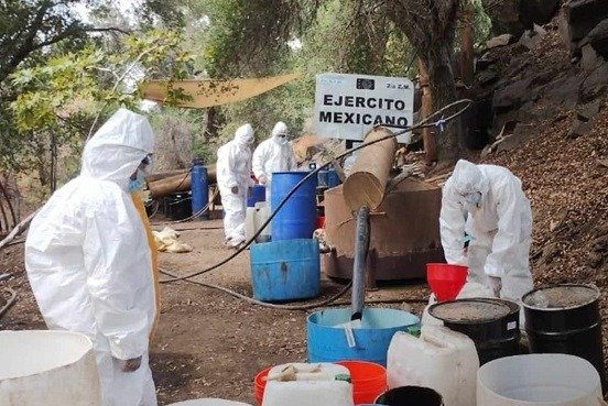 Personal del Ejército Mexicano al realizar reconocimientos terrestres localizaron un laboratorio clandestino, por lo que establecieron perímetros de seguridad y el resto de la fuerza procedió a revisar el área.