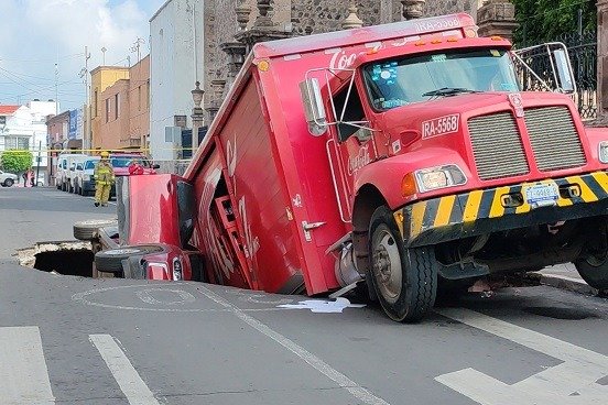 Irapuato, Guanajuato.- Un socavón sorprendió a los habitantes de la Zona Centro de Irapuato cuando un camión repartidor de una empresa refresquera y un automóvil cayeron en él mientras esperaban el cambio del semáforo. El incidente ocurrió este viernes a las 8:15 de la mañana en la calle Altamirano, cerca del cruce con Revolución, dejando a cuatro personas con lesiones leves que fueron atendidas de inmediato.